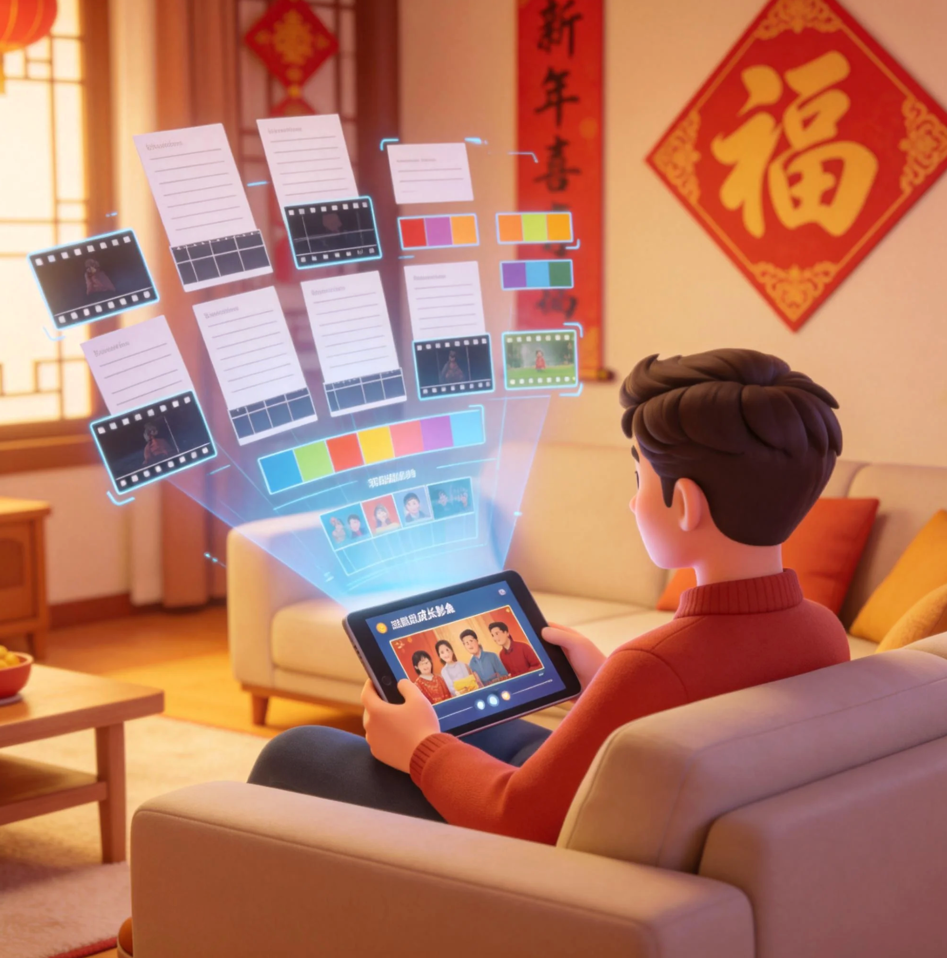 再说路线B,我称它为**“表达链路”。同样是春节,你看着亲戚群里刷屏的拜年图、短片、小剧场,突然也想做一个:给孩子做个成长影集,给爸妈做段祝福短片,给小店做个开年上新展示。你丢出几句想法,它能把脚本拉出来,把镜头拆出来,把画面风格统一起来,甚至把适合传播的标题、封面、节奏都一并给到。你不用懂太多专业流程,也能把“我想表达”变成“别人愿意看”。这类应用拼的不是“能不能生成”,而是“能不能生成得可用、可改、可复用”,能不能让你在短时间里跑完从灵感到作品的全流程。“创作这件事,最值钱的不是灵感,而是把灵感送到人群里。”**